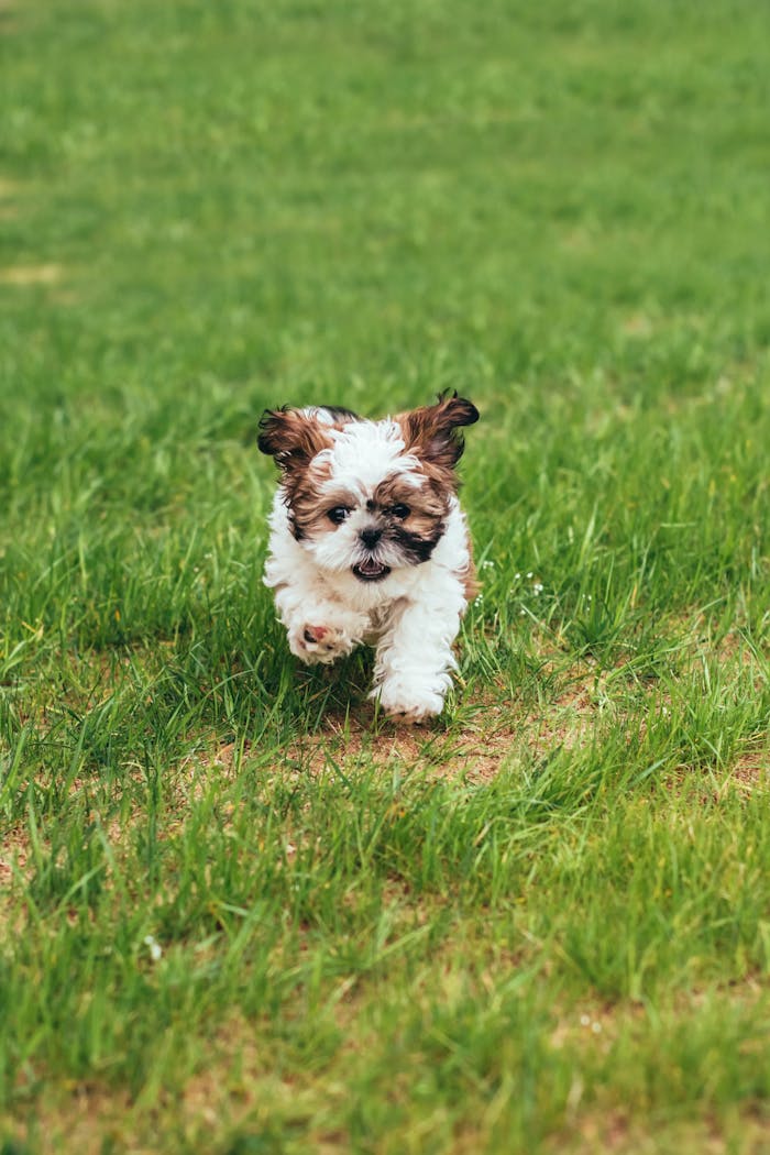 Adorable Shih Tzu puppy energetically running on a green lawn outdoors.